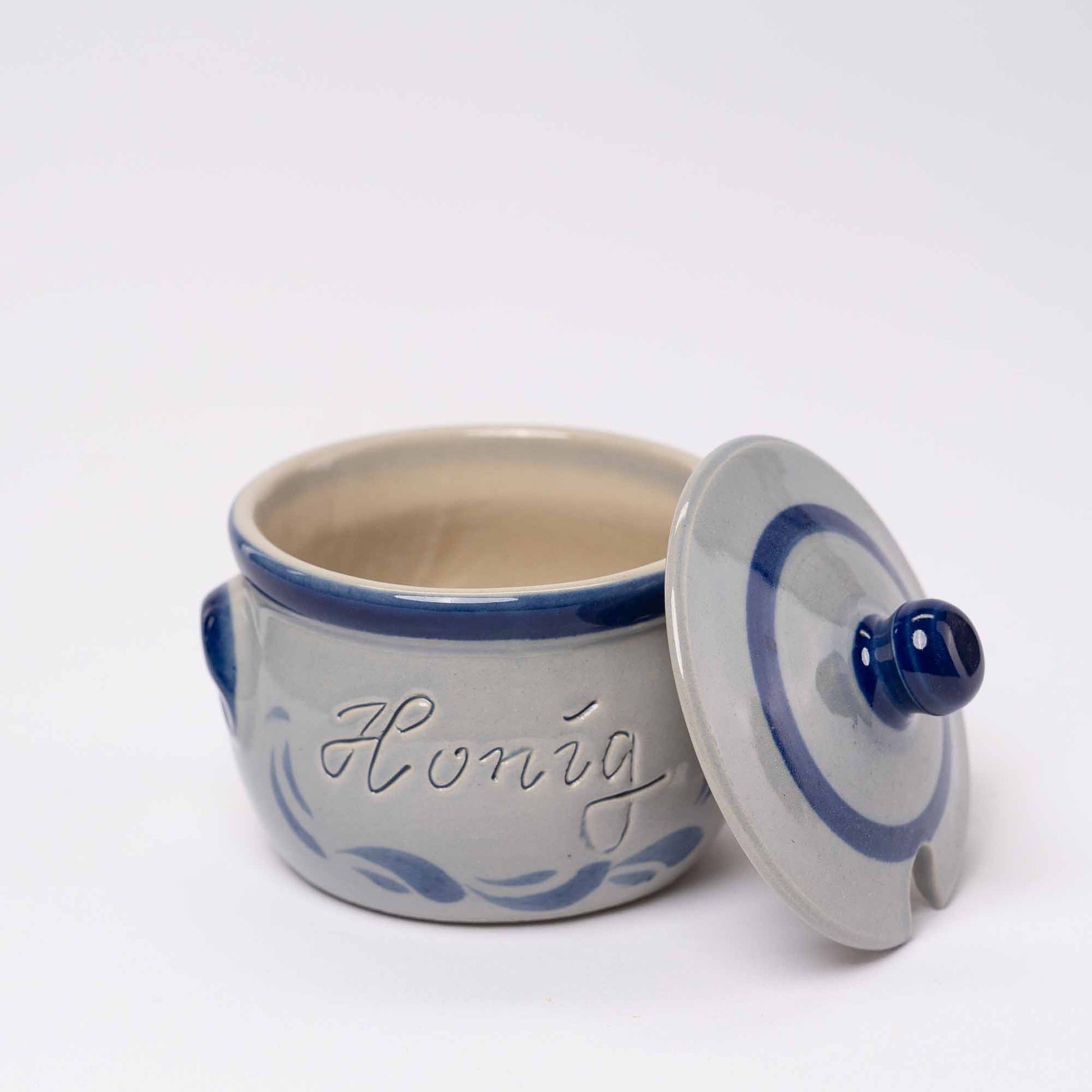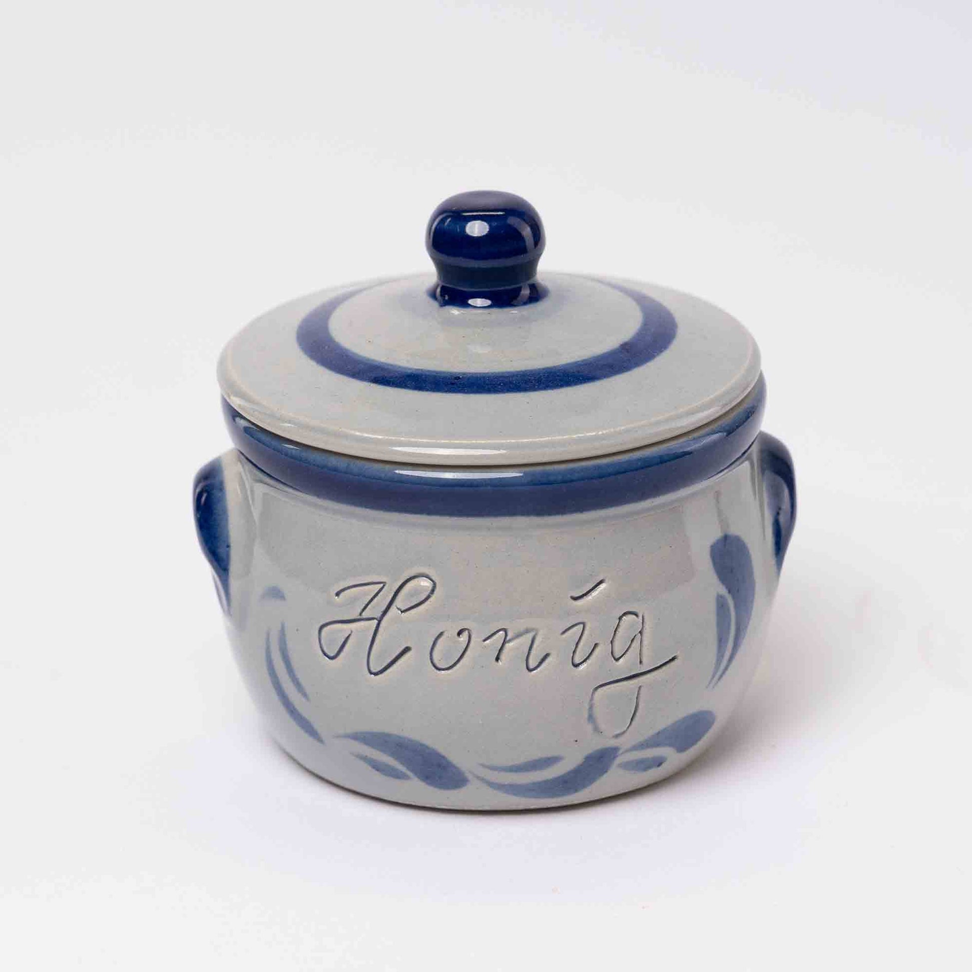 Unsere schicken Frankfurter Honig Dippe aus Steinzeug mit traditioneller Malerei Bembelschwung (Handarbeit) und lebensmittelechter Glasur.